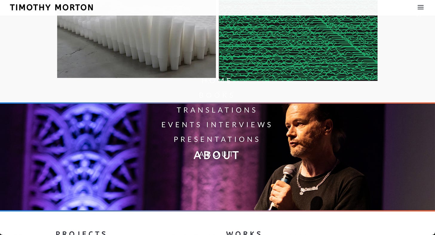 If you have ever considered creating a website, please consider asking Carlyle Coash to do this for you. I’m so incredibly pleased with my brand new (just an hour old!) site, timothy-morton.com. You’ll find links, upcoming events, books, lectures, podcasts, music, everything in one place.